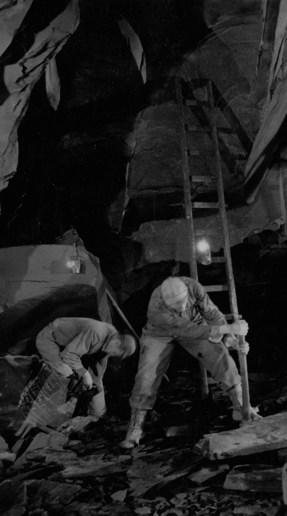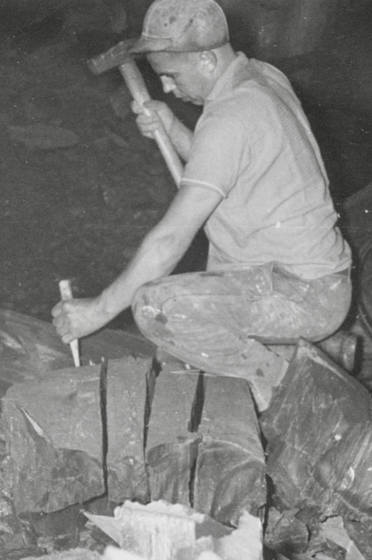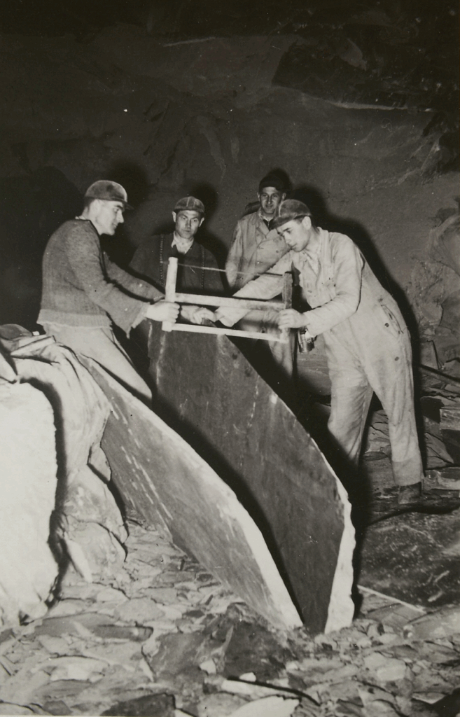 Wichtig war, dass die Platten noch „bergfeucht” im Spalthaus ankamen, nur so behielt der Schiefer seine Spaltbarkeit und ließ sich dort in seine endgültige Dicke spalten.