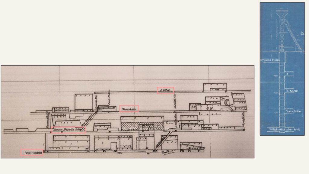 Im Wilhelm-Erbstollen wurden für den Schieferabbau untertägig zunächst drei Sohlen aufgefahren, die jeweils im Abstand von 25 m angelegt wurden (Erbstollensohle, Obere Sohle und 3. Sohle). Diese waren über Blind-, Schräg- und Treppenschächte und ab 1905 über den Ernestine-Schacht mit einer Teufe von 108 m miteinander verbunden. Der Ernestineschacht diente auch der Hauptwetterführung. Neben diesem dienten spezielle Wetterschächte der Bewetterung, so zum Beispiel an der Adolfstraße in Höhe der Villa Schwabsburg (heute Zahnklinik).